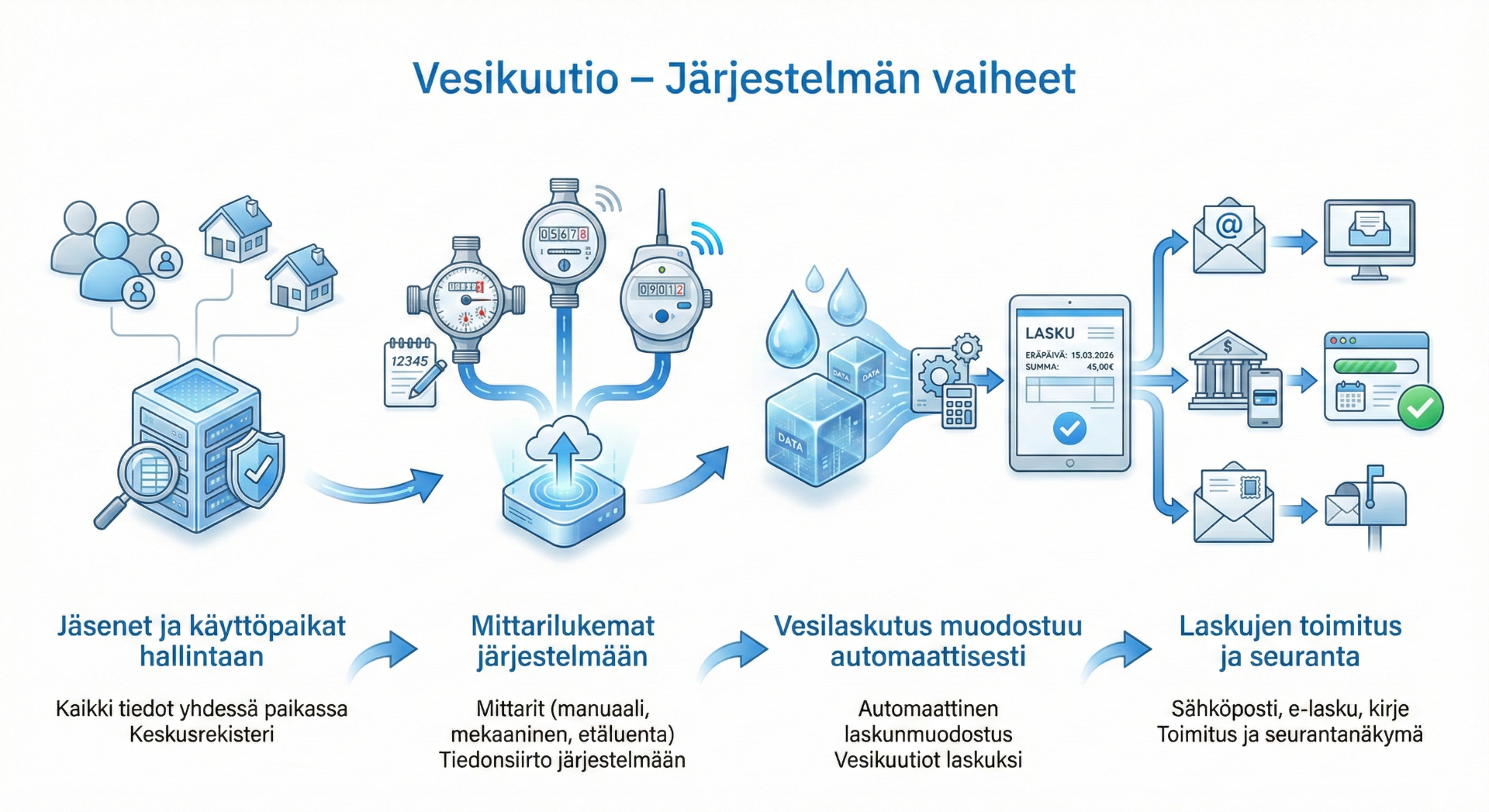 Vesikuutio on suunniteltu vesiosuuskuntien todellisiin tarpeisiin. Se yhdistää hajallaan olevan tiedon yhdeksi kokonaisuudeksi ja automatisoi rutiinityöt, jotka aiemmin veivät paljon aikaa. Näin hallinnollinen työ kevenee ja aikaa jää olennaiseen: toimivan vesihuollon ylläpitämiseen ja jäsenten palvelemiseen.